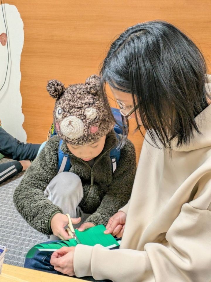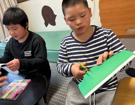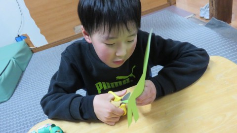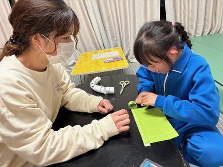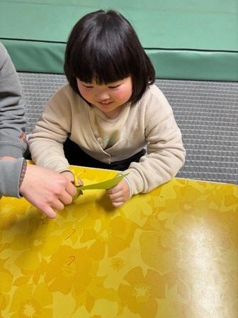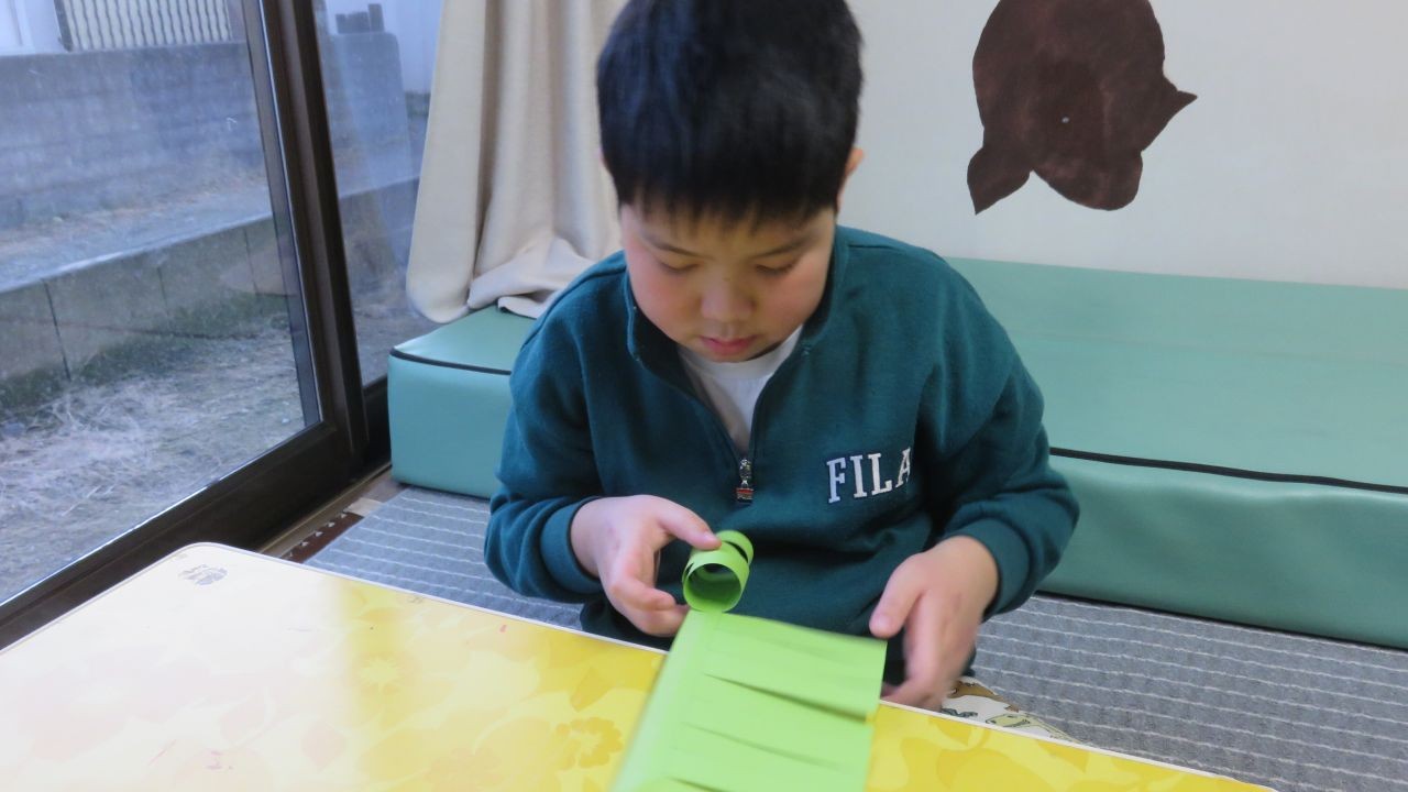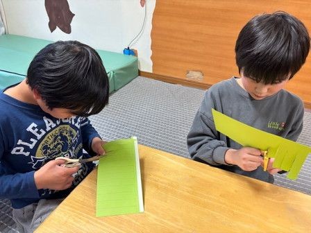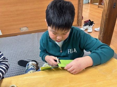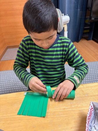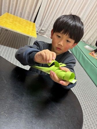 ハサミで切って、両面テープで丸くなるようにとめて、形を整えます。みんなとっても真剣な表情で取り組みました😊